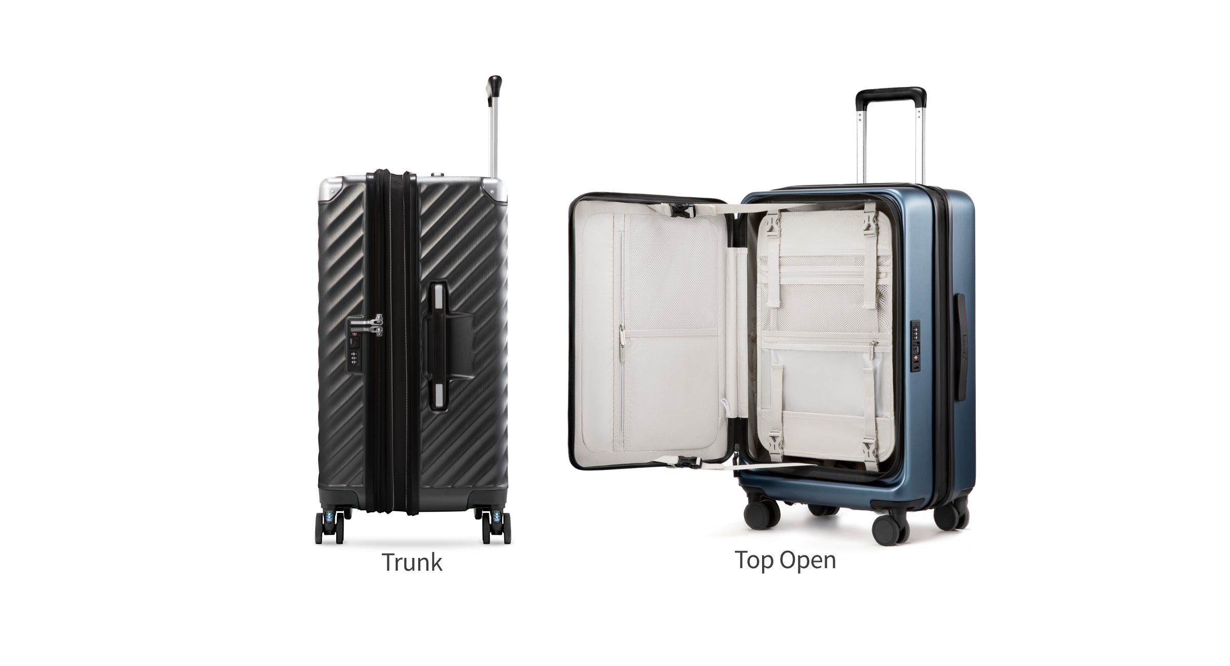 One of the most noticeable differences between Top-Open and Trunk luggage is how the suitcase opens and how the interior space is divided.