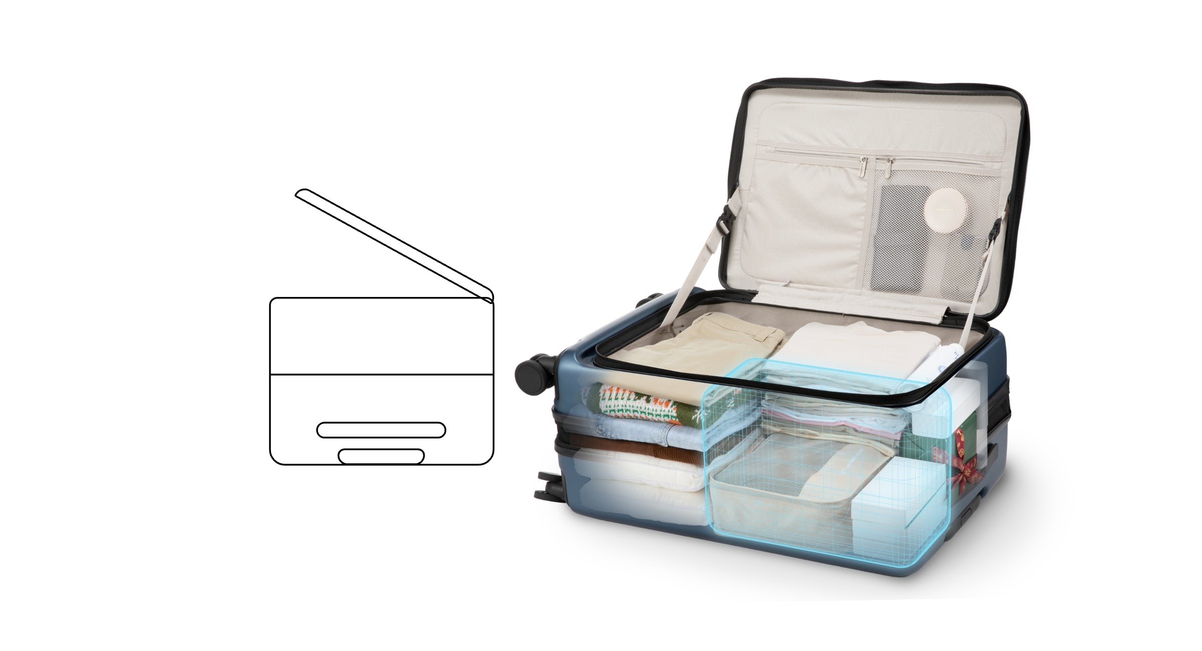 Top-Open luggage is designed with a larger main packing compartment and a slimmer lid section, creating a layout that supports vertical packing.