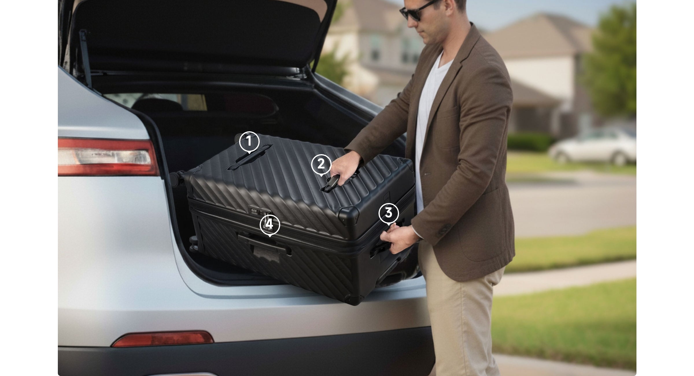 commonly includes multiple grab handles, making it easier to lift into cars, overhead storage, or luggage racks.