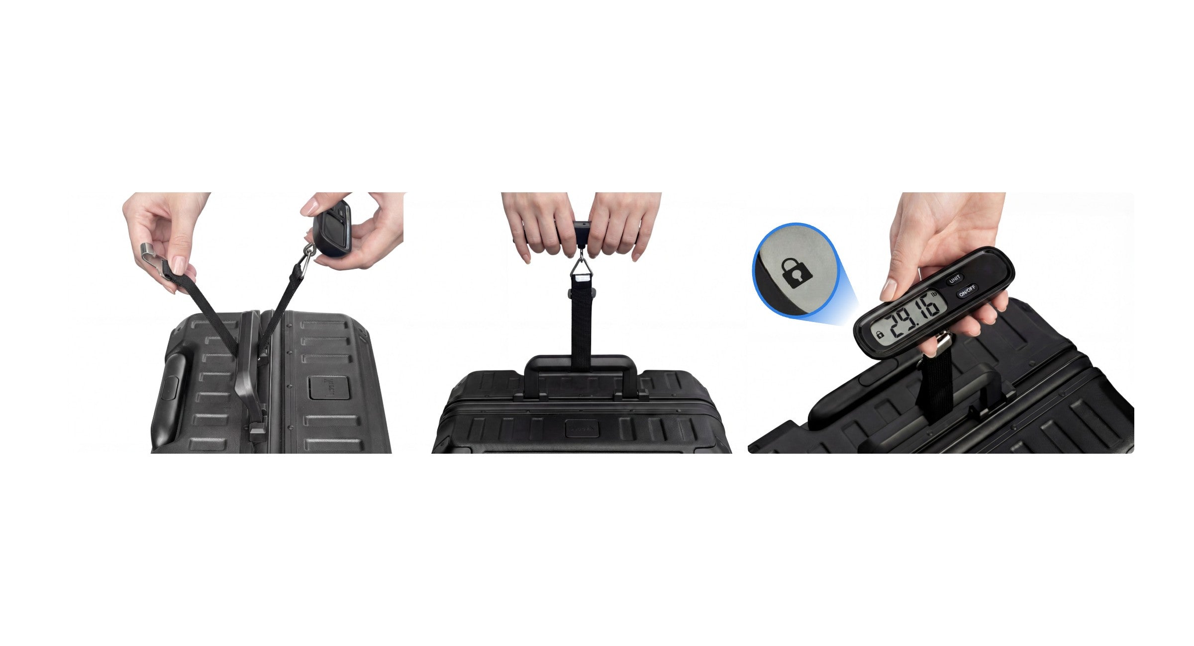 2 Please lift the luggage with both hands and keep the scale completely level for accurate weight measurement.