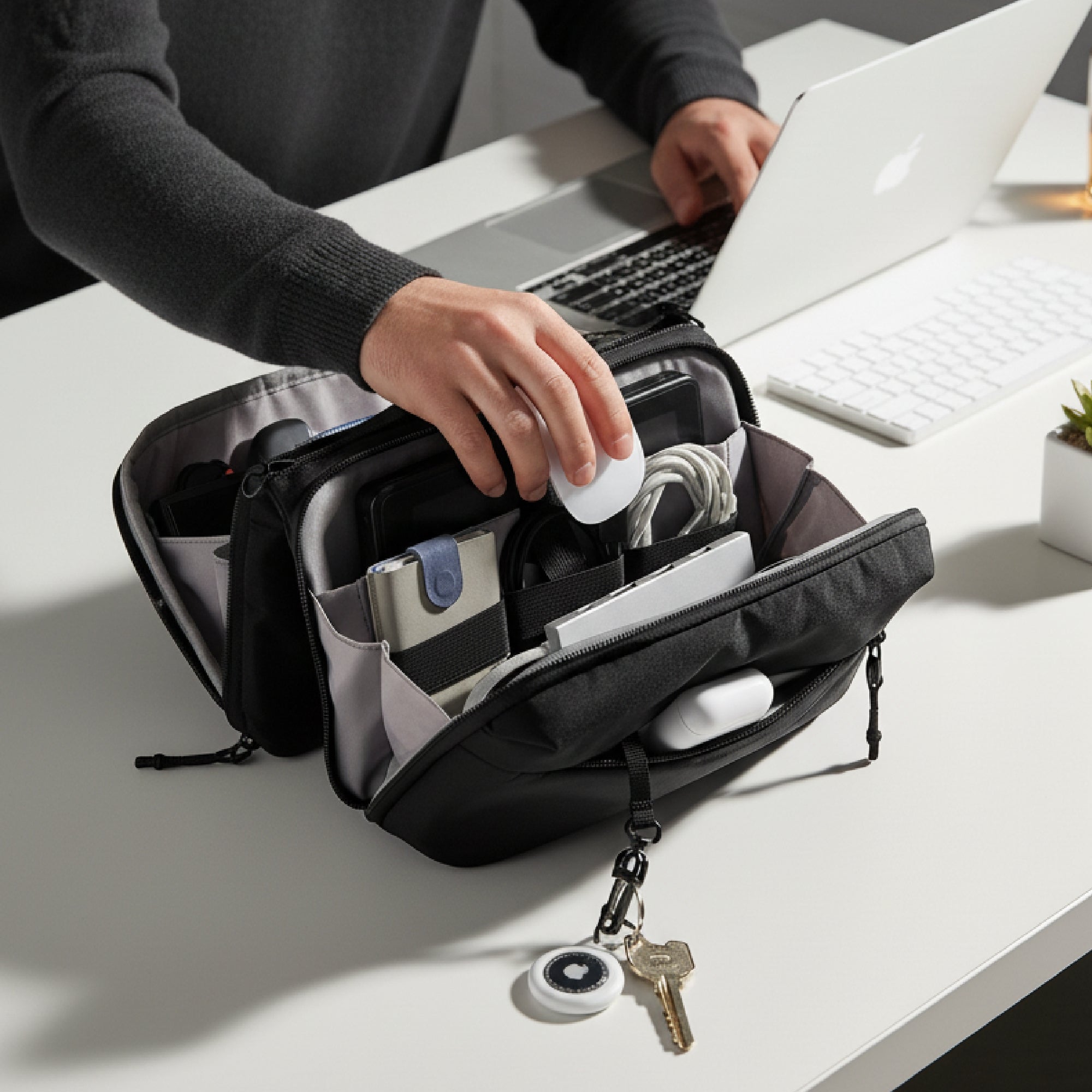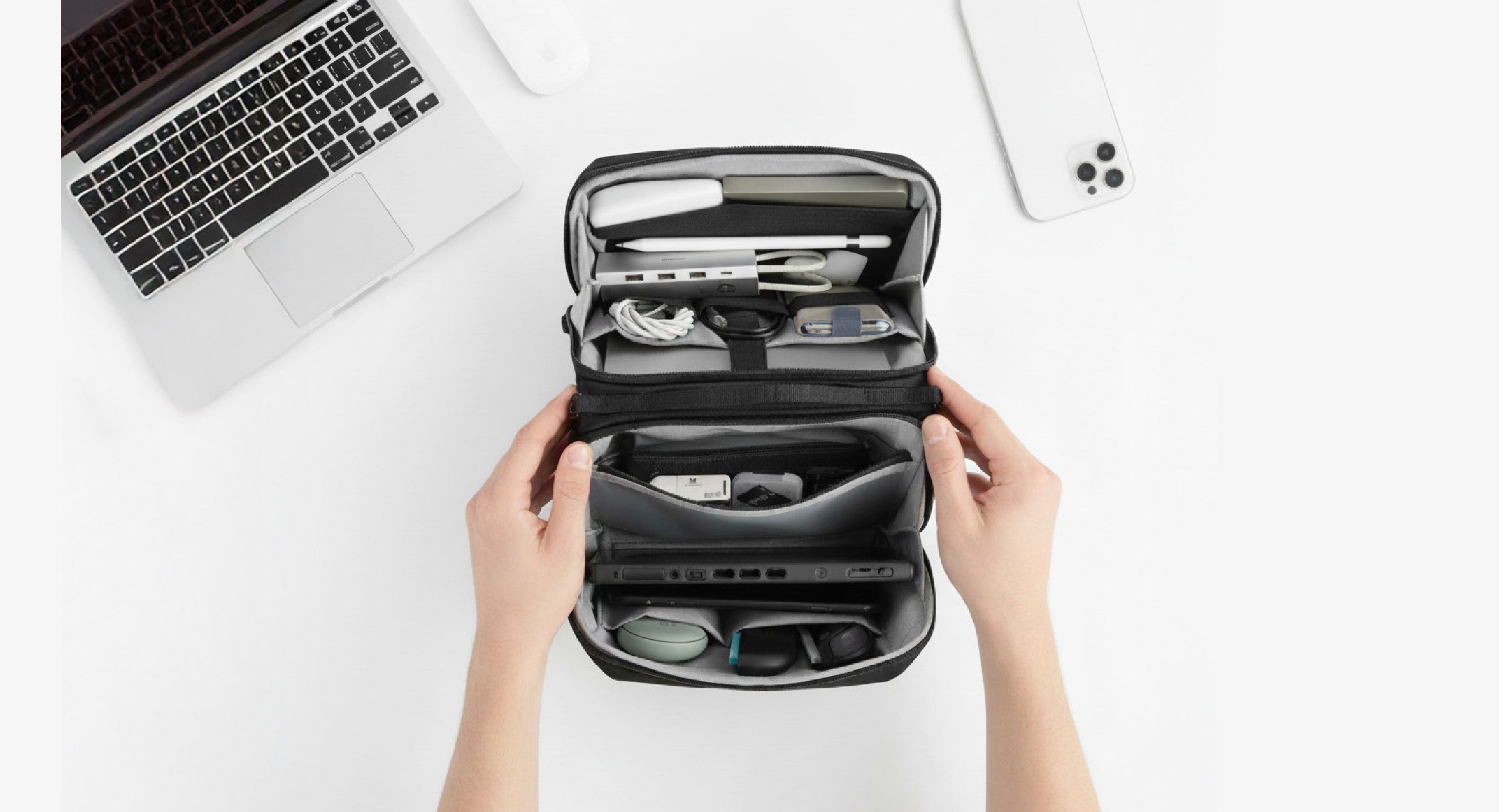 Lightweight, versatile, and built to handle daily use, this organizer seamlessly transitions from a tech pouch to a crossbody bag or hand-carry case—keeping your setup clean, efficient, and always ready.