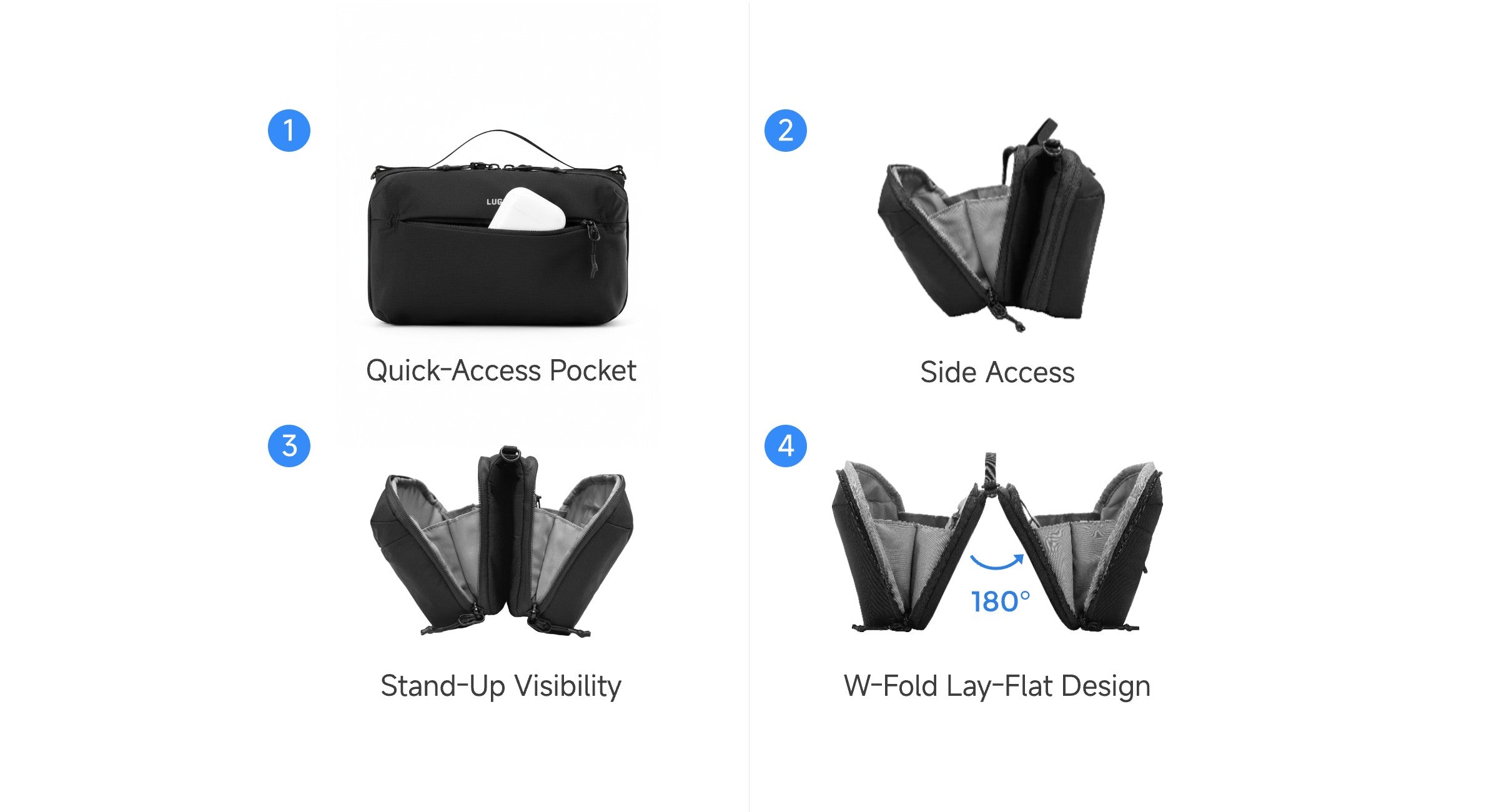 - Four access modes: external pocket, side access, stand-up visibility, and W-fold lay-flat