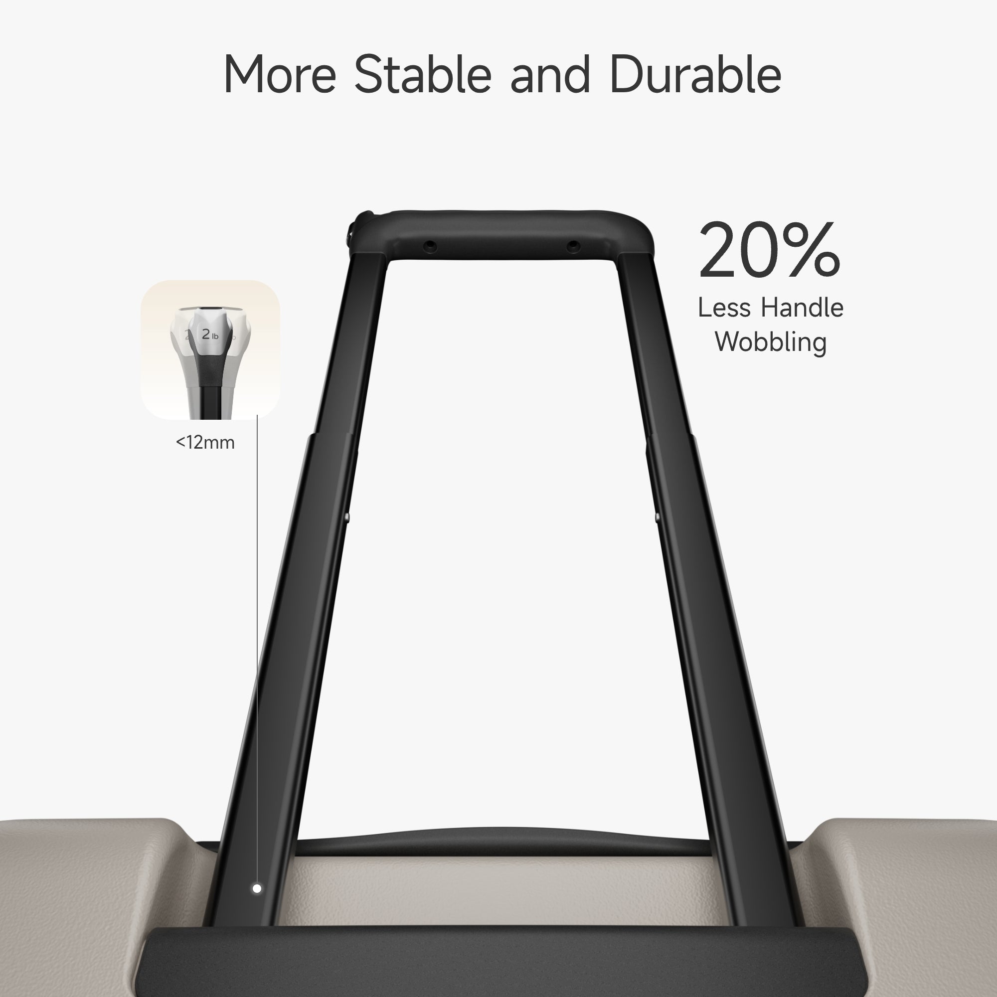 The telescopic handle has just 12mm wobble—20% more stable than industry standards. Made from lightweight, durable aluminum, it stays steady, even fully packed or on rough surfaces.