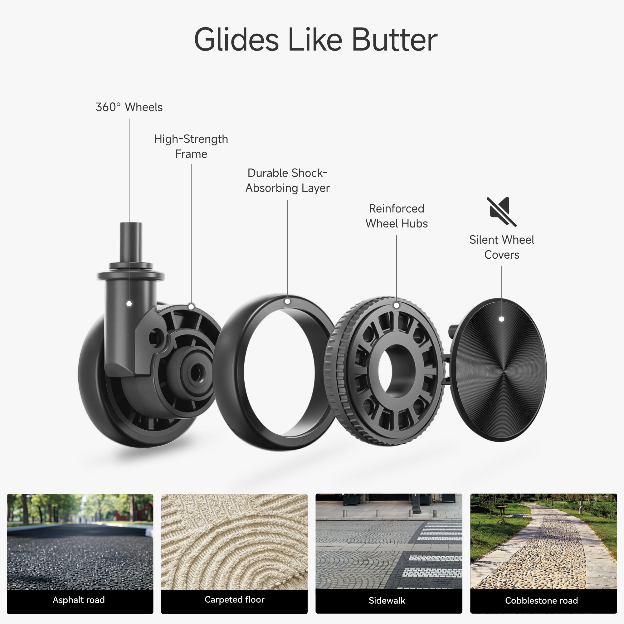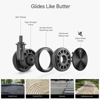 Our product boasts 360° wheels and a tough frame, with a durable shock-absorbing layer and reinforced hubs for stability on any surface. Silent wheel covers make it perfect for asphalt roads, carpets, sidewalks, and cobblestone paths, ensuring a great user experience.