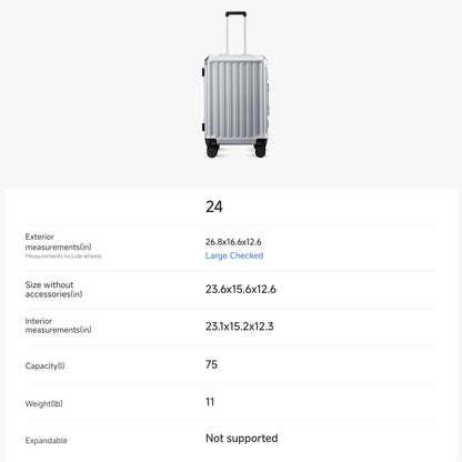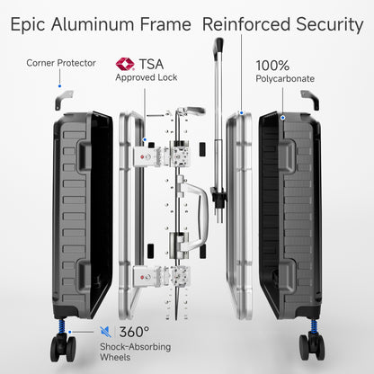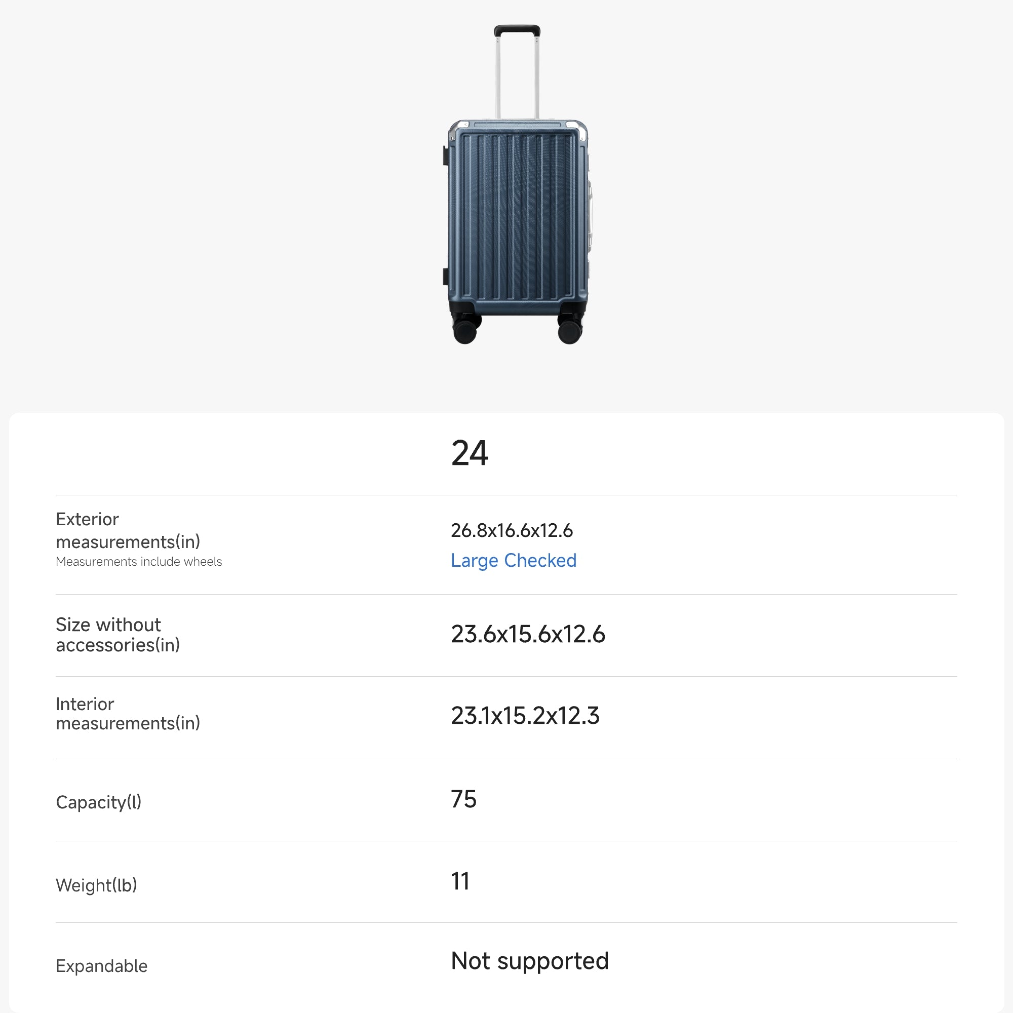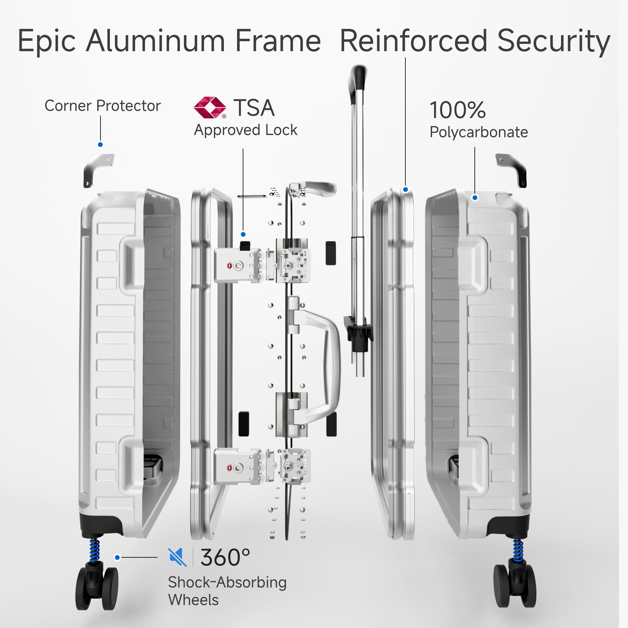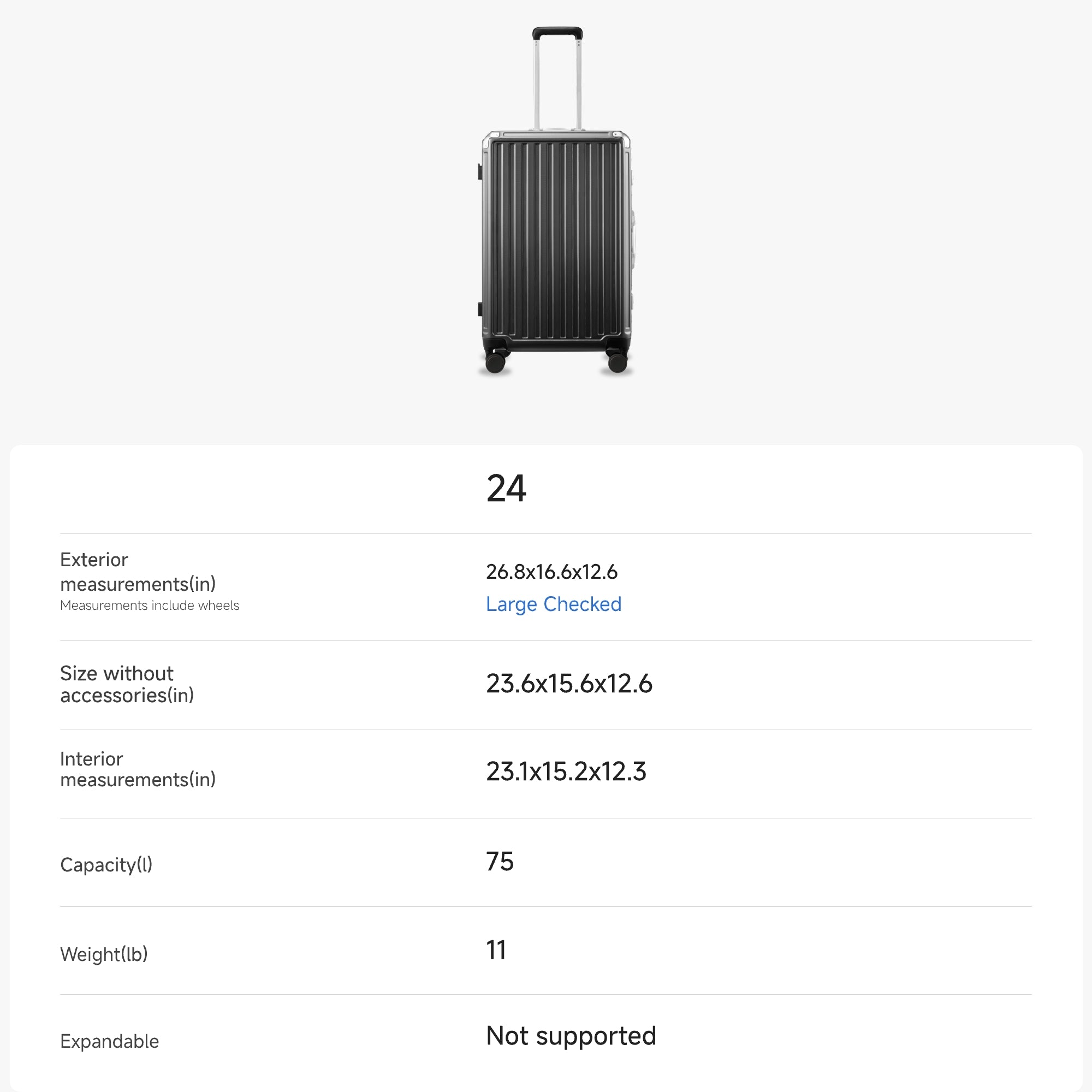 Equipped with a zipperless TSA-approved dual lock system, this check-in keeps your belongings secure and gives you quick access without the hassle of zippers. Spring-loaded 360° suspension spinner wheels ensure smooth rolling across airports and city streets, while aluminum corner protectors add extra defense against impact.With a 24-inch check-in size, it offers expanded packing space for longer journeys while staying durable enough to protect everything inside.